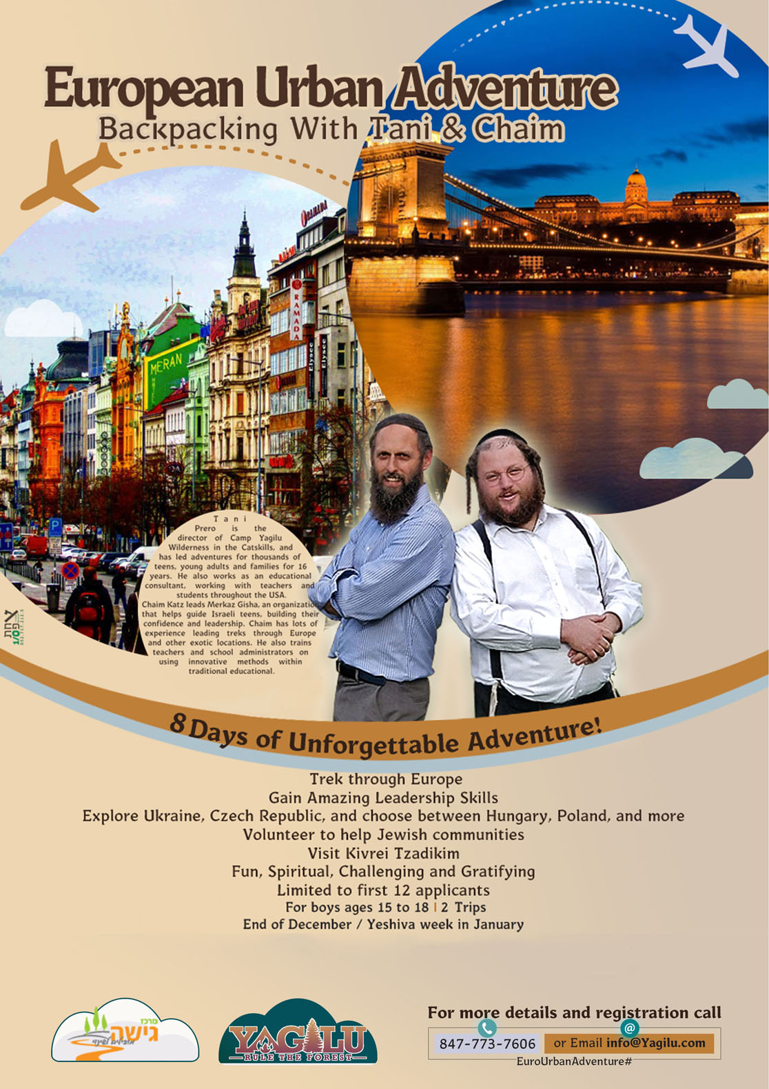 8 amazing days of international adventure, teamwork, and simple living. The boys will journey between cities and countries, while learning to ask help from locals. At the same time, the boys will contribute to the communities that they pass through. They will visit underprivileged communities, volunteer and help them out, visit amazing Jewish and historical sites, learn about themselves and about others.